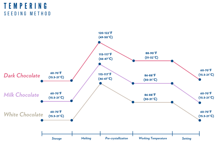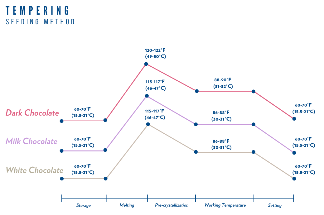 Tempering is the process of turning melted chocolate into a solid mass of stable cocoa butter crystals with a fine, even-grained texture, accomplished with controlled cooling of the chocolate with agitation, to form many fine-grained beta crystals, as opposed to other crystal forms which are unstable and of random formation. Below are guidelines for two types of tempering methods - Seeding Method and Tabling Method. Please note that the temperatures and methods here are intended to serve as a guide; true temperatures may change pending equipment and room temperatures. Please contact your local Guittard Sales Representative for specific questions and guidance or give us a ring at 1-800-HOT-CHOC.