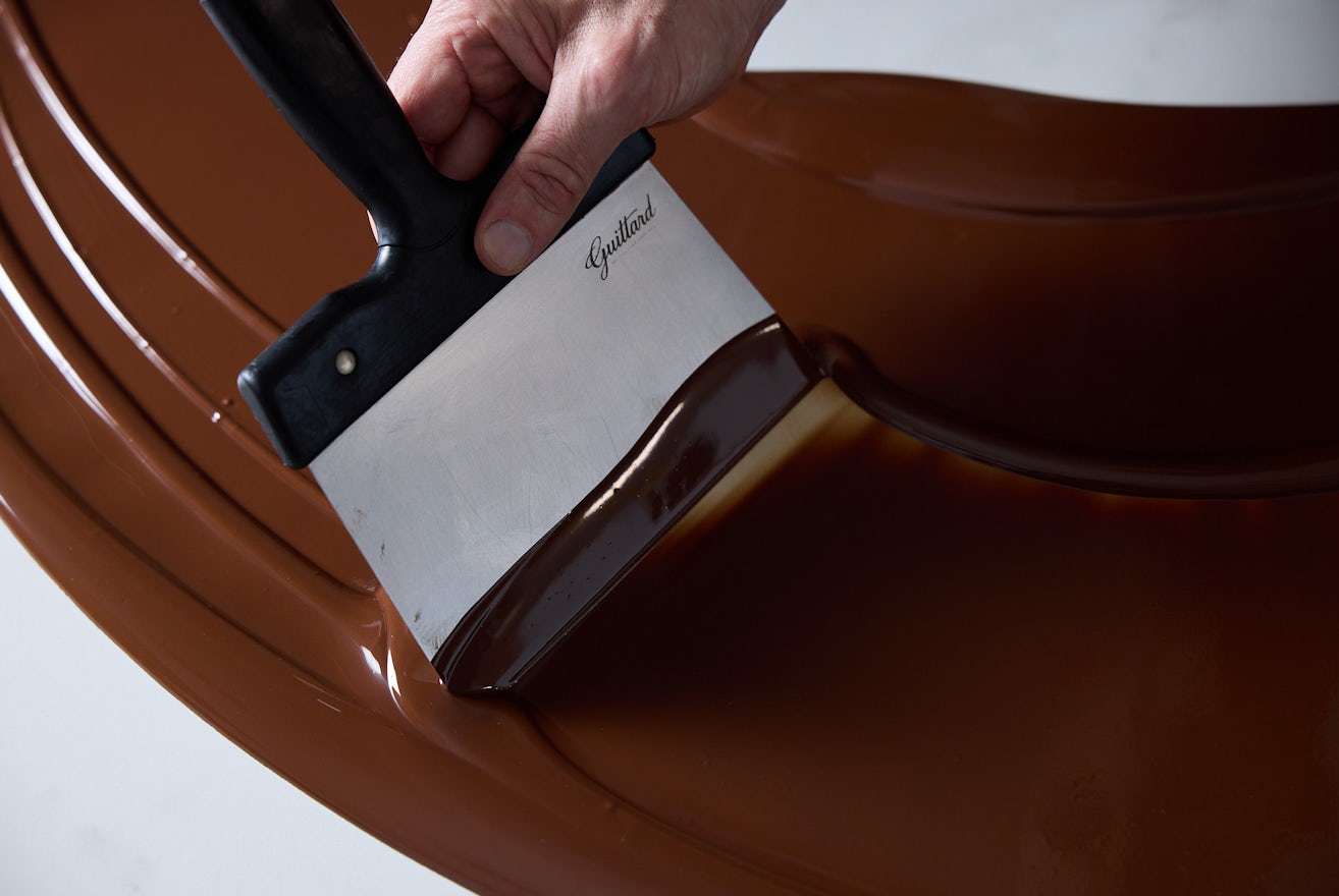 Begin a uniform motion of spreading the chocolate outward with an offset spatula and scraping it back inward onto itself. Repeat this action until the chocolate looks and feels thicker from the crystal development.