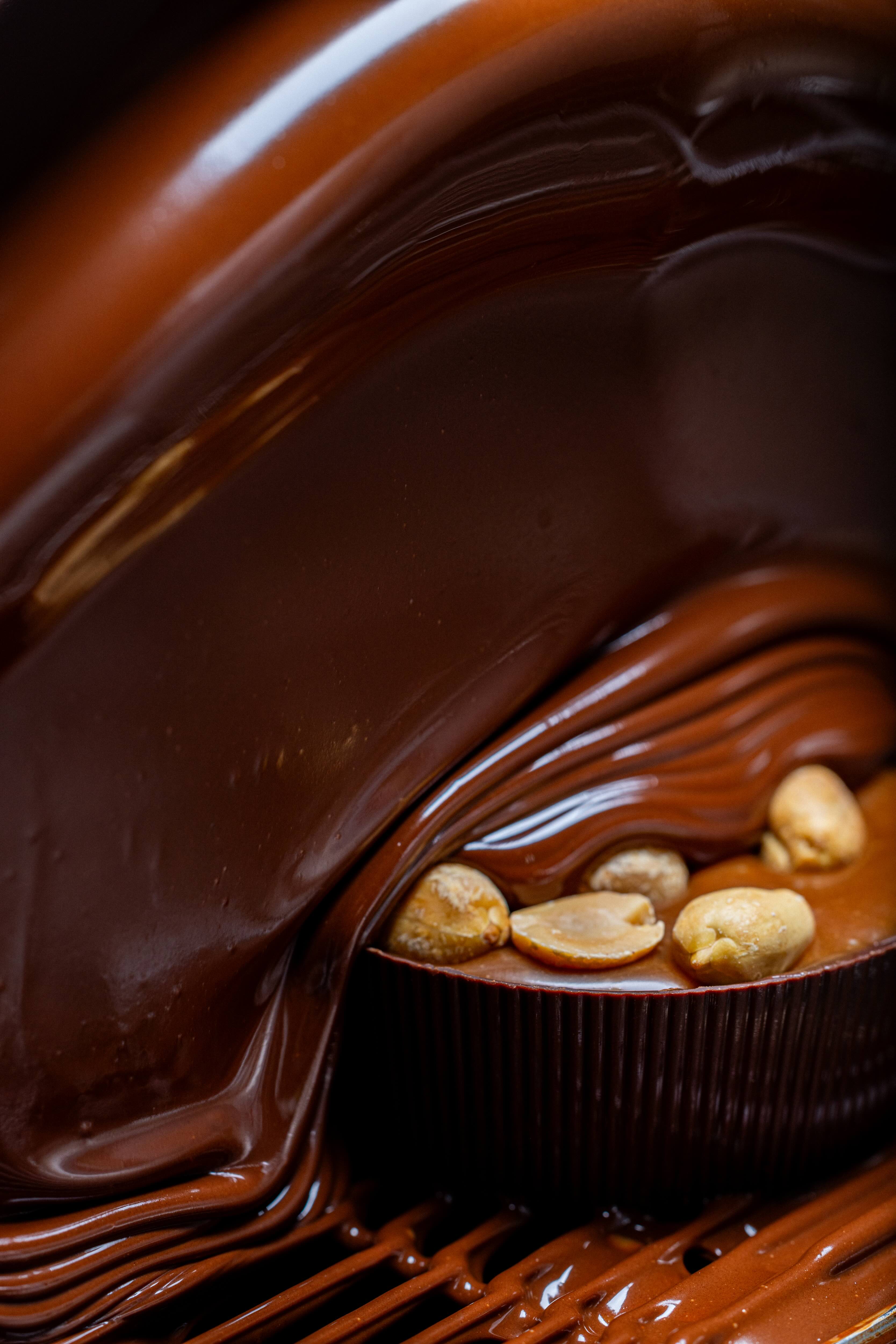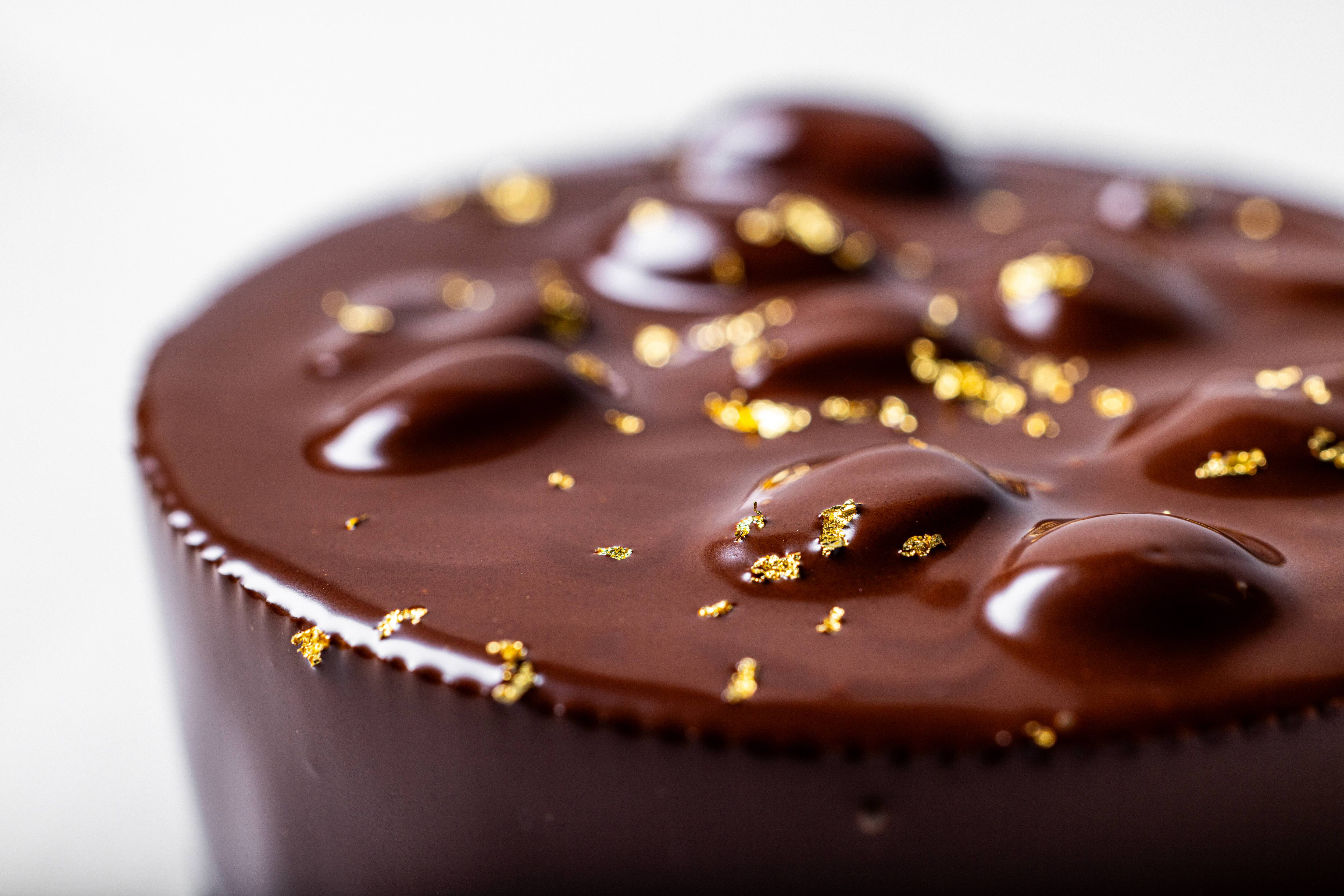 Cool the caramel to 80°C. Pour over the chocolate and emulsify with an immersion blender.