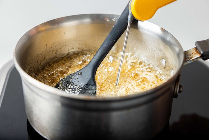 Cook the water, sugar, glucose, and honey to 140°C.