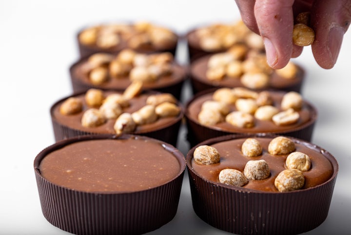 Pipe an even portion of ganache #1 into the mold, gently press a nougat portion into the ganache.