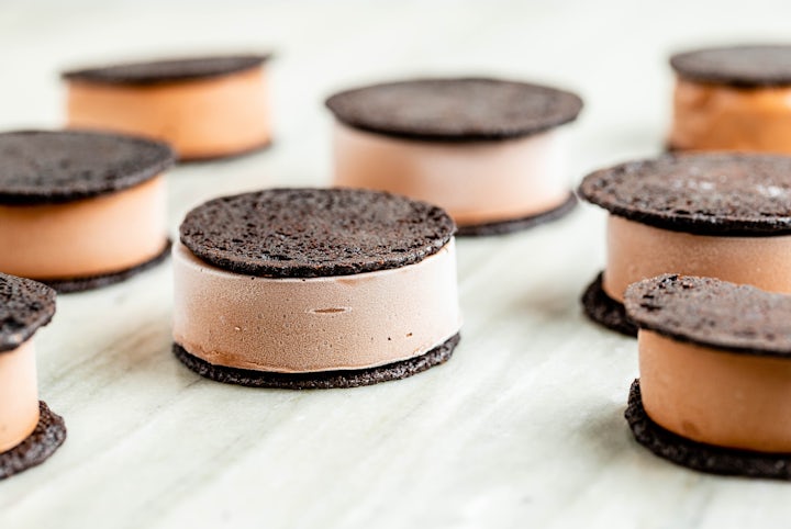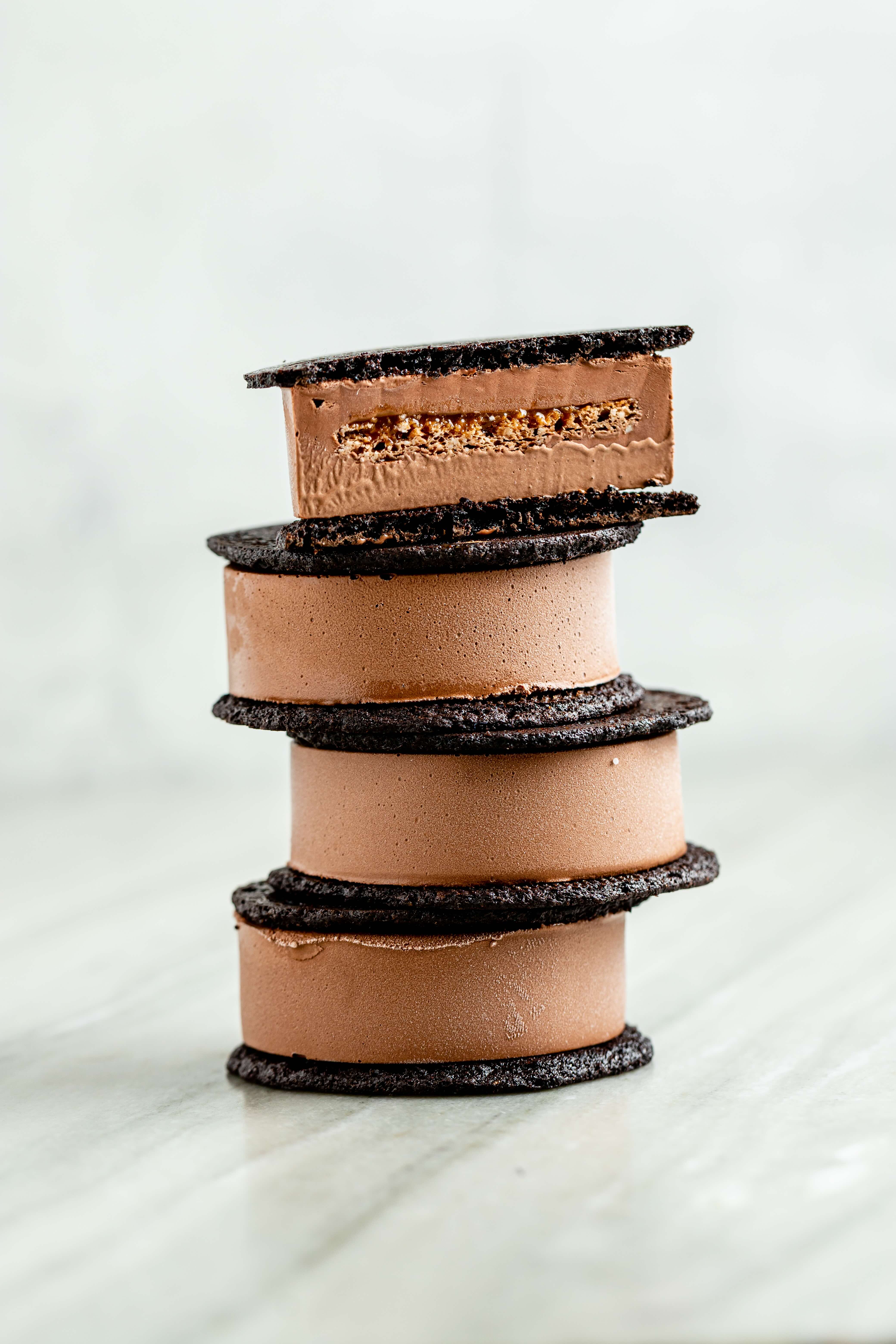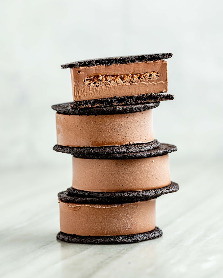 Remove the gelato from the mold and apply pre-baked cookies. Place into a freezer for at least 24 hours, allowing the cookies to soften slightly before enjoying.