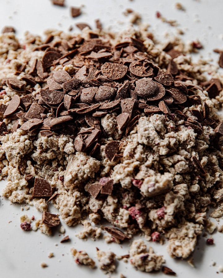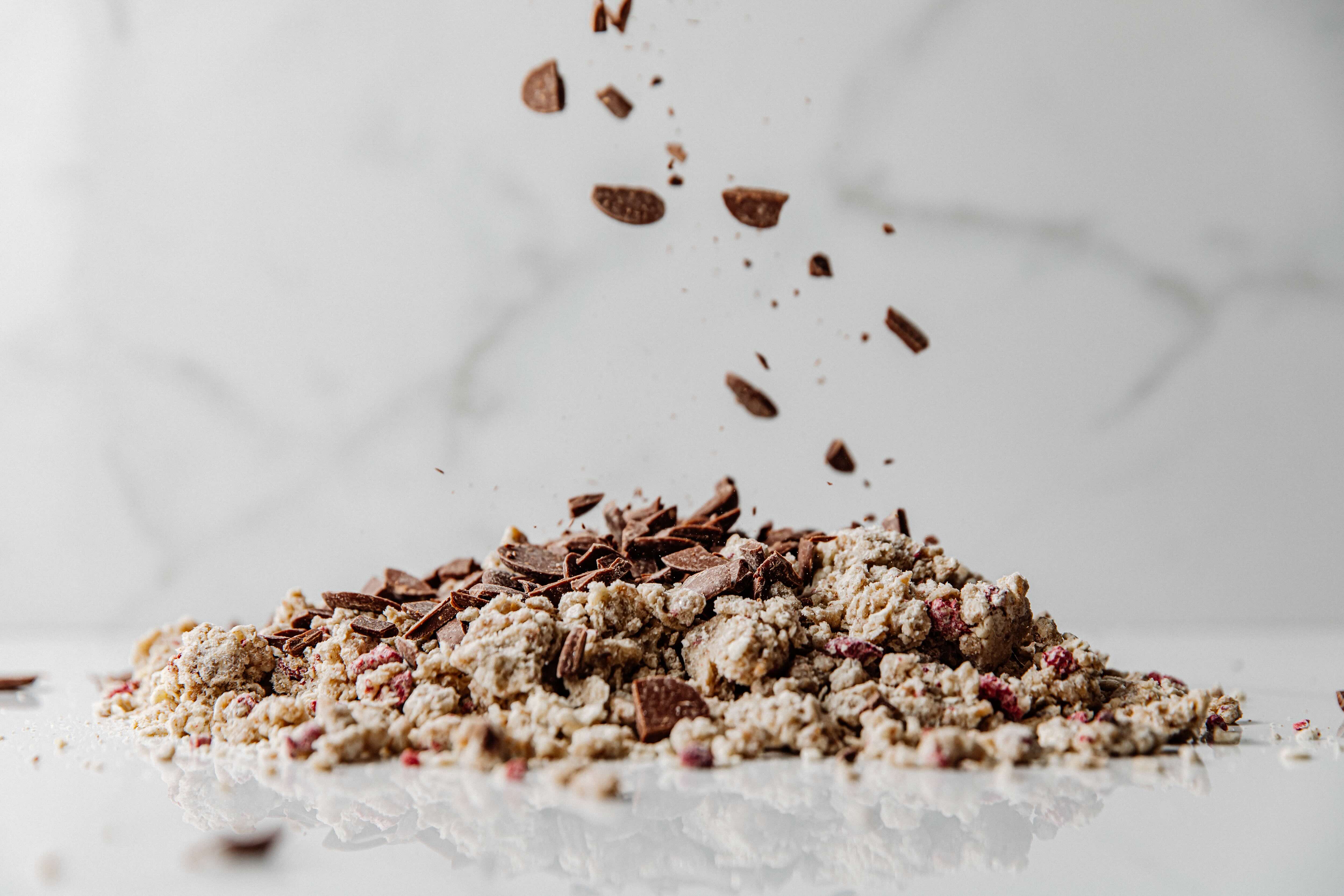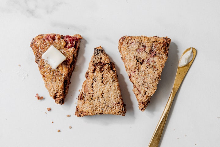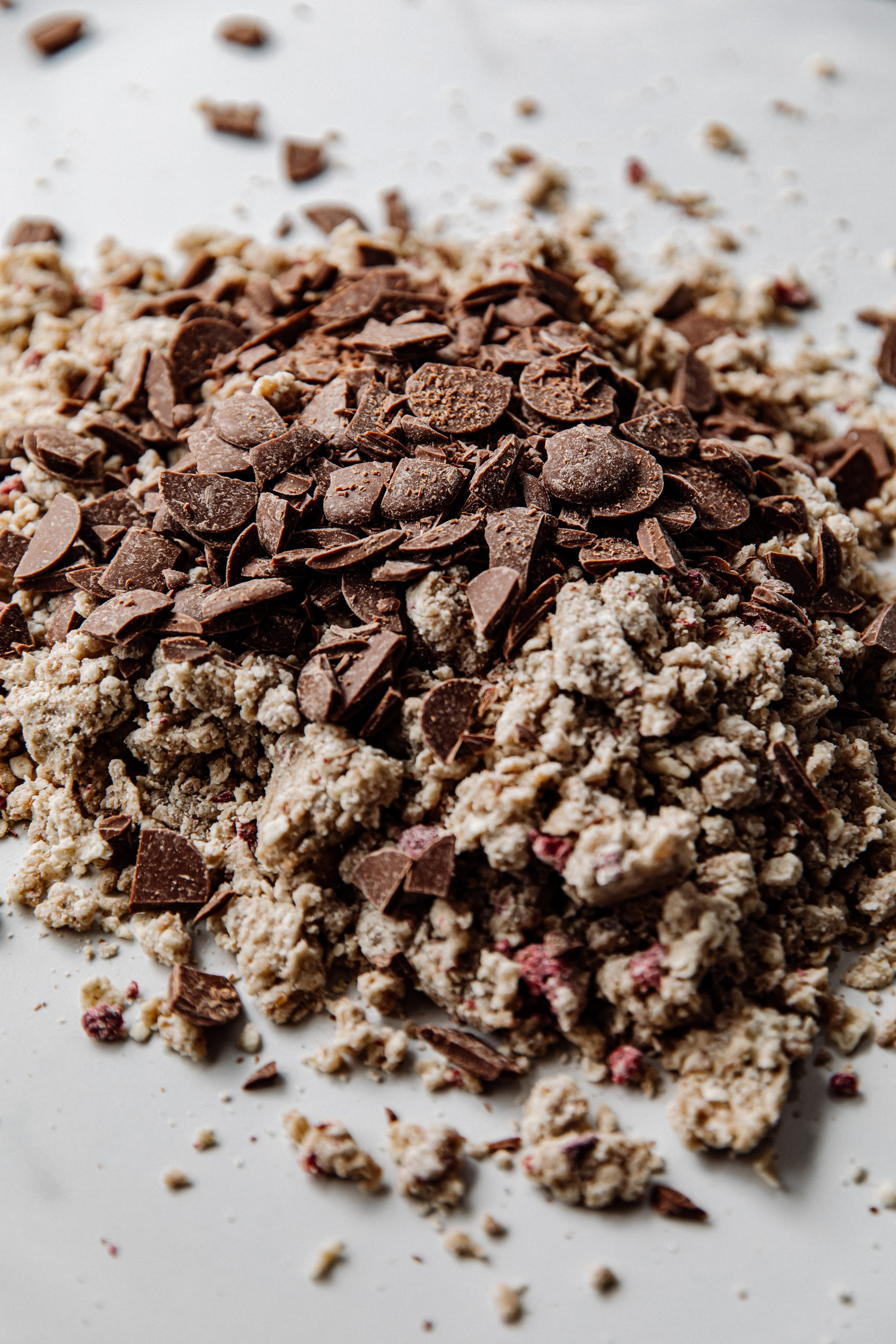 Combine all the dry ingredients and begin cutting butter in using 2 bench scrapers. Once the butter is cut in and flaky, add the soaked oats and honey, and continue to cut in until a shaggy dough forms. Add the pecans, chopped milk chocolate and whole raspberries and cut in until a dough begins to form. Finish bringing the dough together by hand on a table that has been lightly dusted with flour.