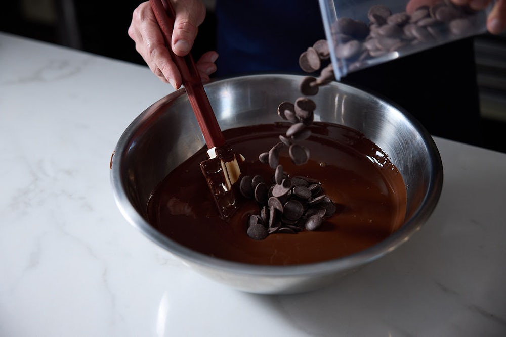 In liquifying chocolate, it is the cocoa butter, the fat, that is actually getting melted – changing from solid to liquid state. Because of the triglyceride composition of cocoa butter, it melts over a temperature range (~90-120°F), not just one single point. This is what makes chocolate so palatable, and for this reason melting is in important part of handling and tempering chocolate.