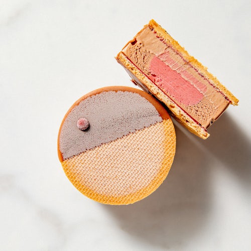 Mold and unmold cherry sorbet into desired shape. Pipe chocolate ice cream into mold and press vanilla insert into mold. Strike mold clean and blast freeze. Unmold ice cream and sandwich with 2 cookies. Dip 1/2 way at –23°C/–10°F.