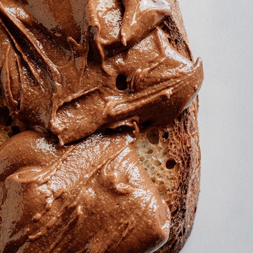 Combine almond-sesame praline, butter and salt in a food processor. Blend until smooth. Ensure praline mixture is at a temperature of 86°F (30°C) or cooler. Add pre-crystallized Soleil d’Or 38%, blend until just combined. Do not exceed 87°F (31°C). Finish blending by hand, then deposit into four 4-oz glass jars and store in the cooler.
