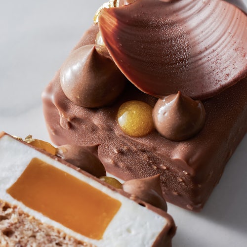 Remove from mold and, using a skewer, dip the frozen form into the 110°F (43°C) coating and allow the excess to drip off. Dip all the way up to the edge, leaving the pecan sponge exposed as the top of the dessert.