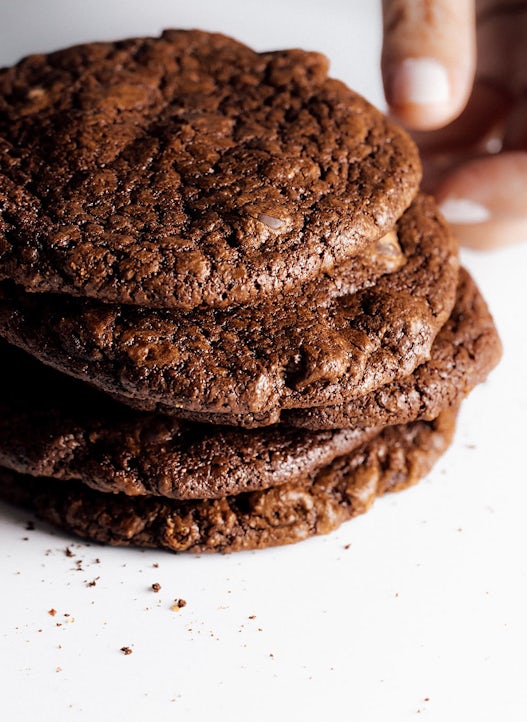 Cream together the butter and the sugars on medium speed until light and fluffy. Add the eggs gradually while mixing to emulsify. Scrape down. Separately, whisk together the flours, baking powder and salt. Add the dry ingredients and mix on low speed to combine. Scrape down. Add the chocolate wafers to combine. Refrigerate dough.