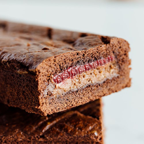 Line a buttered frame with the dough, leaving ½” excess all around the frame. Mix one part chocolate pastry cream with one part of almond cream. Spread a thin layer of raspberry jam in the frame. Pipe the pastry cream mixture onto the jam.