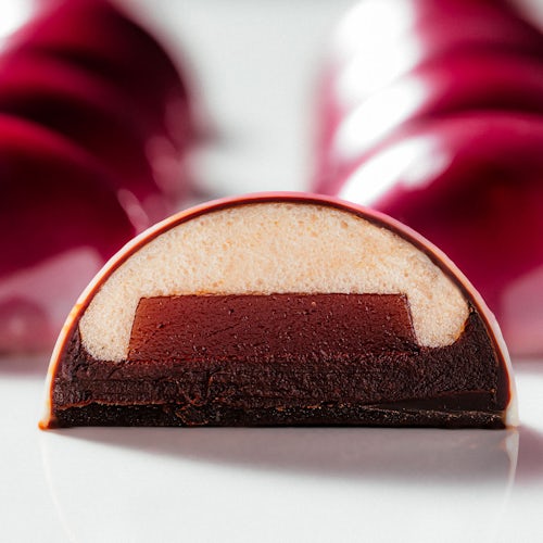 Remove from mixer and pipe into precast chocolate shells, 1/3 full. Press disc of pate de fruit into marshmallow layer.