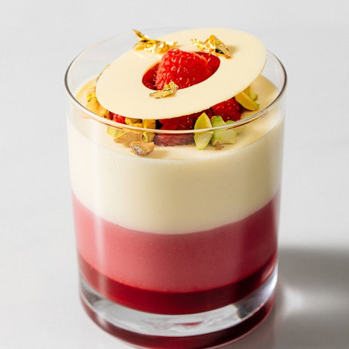 Allow verrines to temper under refrigeration and garnish with raspberries, pistachios, confectioner’s sugar, white chocolate décor, and gold leaf.