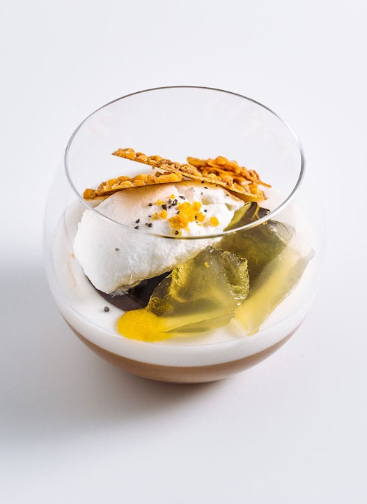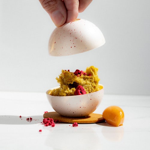 Line the mold with tempered white chocolate, flip over and remove any excess chocolate. Allow to crystallize. Remove from mold. Heat the tip of an 11 mm piping tube and punch out the chocolate at the top of one sphere per dessert.