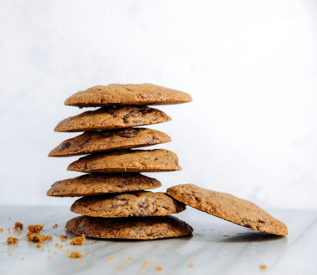 Preheat oven to 320°F. Line a baking sheet with parchment paper. Beat together the butter and sugar. Add egg and vanilla extract. Gradually add all dry ingredients, and continue to mix until just combined. Add in chocolate baking chips and mix until combined. Scoop the dough into approx. 1 1/2 oz [45g] balls, and onto baking sheet. Bake for approximately 9 minutes or until just golden brown.